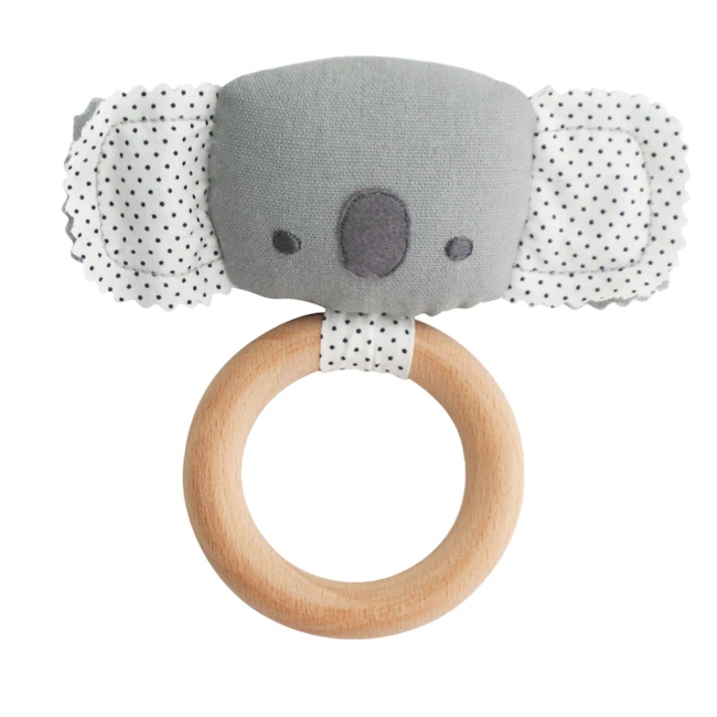 A cute koala rattle teether.Clean beechwood teething ring damp cloth, warm soapy water, rinse and line dry.