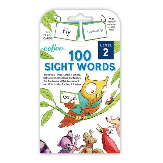 eeBoo’s well-considered version of a fundamental educational tool. Sight word flash cards include 100 high frequency word flash cards, 18 learning activities, instructions, a checklist, and two rings to help children move through the deck of 100 cards by level. Level 2 includes high frequency simple words for children to learn through memorization, creating a foundation for literacy. Each flash card has the Sight Word on the front and a sentence to provide context on the back of the card.