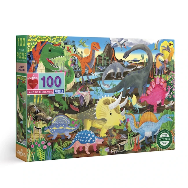 Land of Dinosaurs 100 piece jigsaw puzzle is the perfect puzzle for young paleontology enthusiasts! This giant, floor-sized puzzle features triceratops, stegosaurus, brachiosaurus, and other dinosaurs living in perfect harmony!