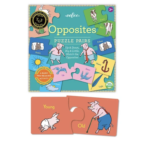 Up & down, big & little, match the opposites. Once a critical mass of words are recognized, preschoolers love to engage in word play. The elder person may select a puzzle piece with a bluebird flying up with the word UP. The tot searches for the one on which the bluebird flies DOWN, and assembles the puzzle pair. This play encourages critical thinking skills.