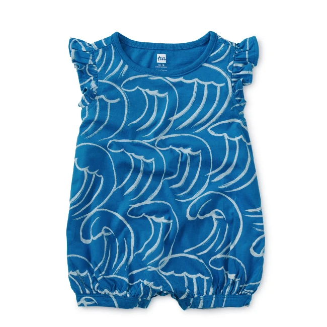 Part of our Japan collection, this Kanagawa wave print takes cuteness up a classy notch. This mid-thigh, warm-weather romper sports short ruffle sleeves and inner leg snaps for easy diaper changes. Crafted from 100% soft cotton jersey.