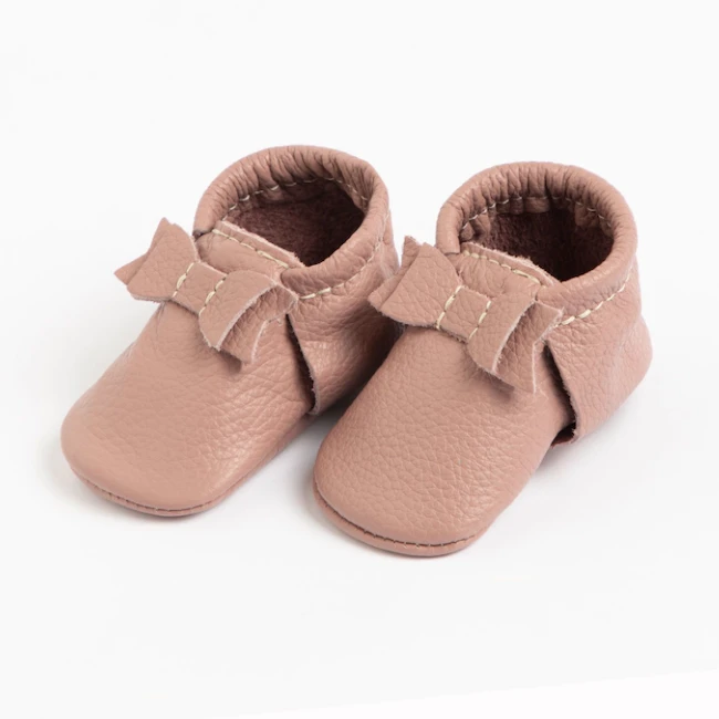 Cradle your tiny baby girl in bow mocc perfection! Made with our soft Rose Pink genuine leather for little newborn feet, a sweetly scalloped collar, and topped with a delicate bow.