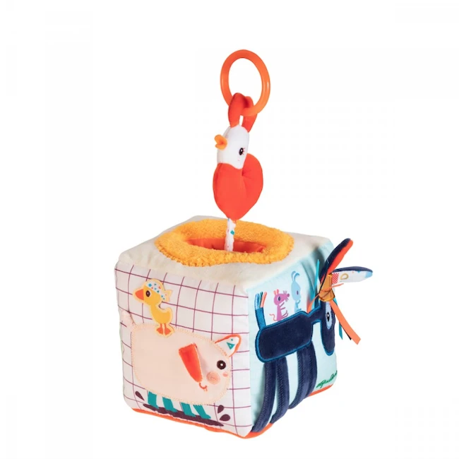 Discover the activities, stories and sounds of this soft farm cube. With teething ring and animal sounds. Stimulates the senses, imagination and motor skills.