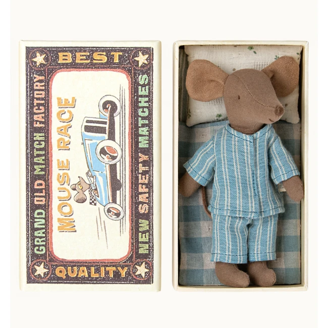 A classic Maileg item. This mouse is ready for hours of play and sleeps tight in the matchbox. The clothes and bed linen come in unique prints and beautiful colours.