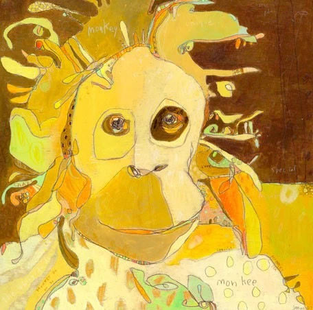 Contemporary wall art featuring an ape’s face in brown and gold.