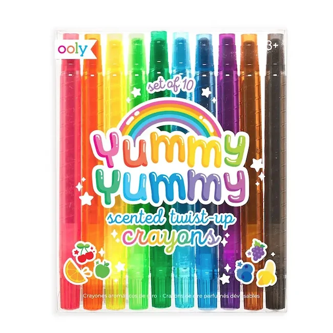 Color and create with Yummy Yummy scented twist up crayons. This set of 10 crayons has fun twist up action and fresh and fruity scents. Twist up Scented Crayons 10 Different colors and scents Easy twist-up barrel Suitable for ages 3 and up