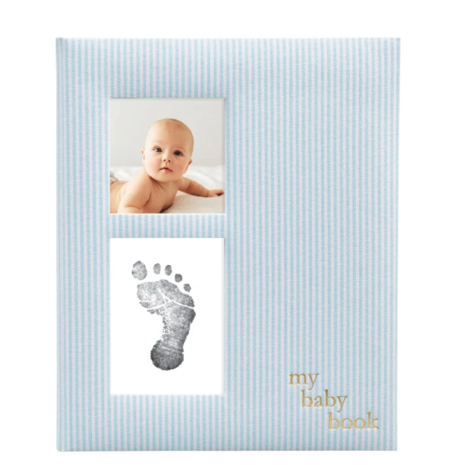 Welcome your adorable new bundle of joy and celebrate all of baby’s moments with Pearhead’s babybook. This blue striped baby book includes 64 guided pages providing a great and easy guideline to create a keepsake memory book for generations to enjoy. The striped blue white pattern on the book adds a cool touch to this baby book and makes it perfect for baby boy! The book also includes “my baby book” debossed in a gold foil adding a special touch to this keepsake journal. It’s the perfect gift for any baby boy! Fill in every detail from the moment you found out you were pregnant to your baby’s first birthday and more! The book is bound in a cool, blue and white seersucker fabric adding an adorable touch for your baby’s nursery or any bookshelf. Display baby’s adorable 3” x 3” photo on the cover of the journal. This baby book also includes a clean-touch ink pad to display your little one’s tiny print on the cover. Your baby’s skin will never even touch the ink so it’s 100% baby safe! To create an impression, make sure the ink is facing down on the included white card and press your baby’s hand or foot onto the clean-touch ink pad. Let dry for 1-2 days. Then you can place the print inside the book easily. Two-time use maximum. For newborns only. Ink pads will accommodate hand/feet up to 2.25” wide x 3.5” long. Don’t forget to add this babybook to your registry! It’s the perfect gift to open at your baby shower and fill in throughout your pregnancy. Even after your little one is grown up, they will love to look back at their baby book and learn all about their first years. Pearhead’s babybook is the perfect keepsake to cherish every moment with your adorable little baby boy. Product dimensions: 9” W x 10.7” H x .6” D; Photo insert: 3” x 3”