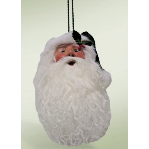 This ornament features the jolly face of a Santa Claus Caroler with a green velvet hat and full white beard. Ready to hang with a ribbon