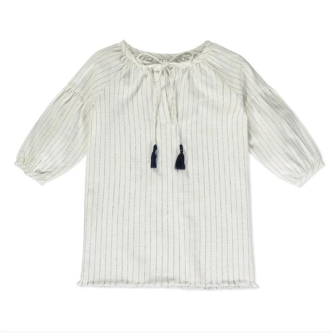 The simple shape of this beautiful pinstripe shift dress makes it an easy and stylish option, With a fun tasseled tie at the neck and hidden pockets.