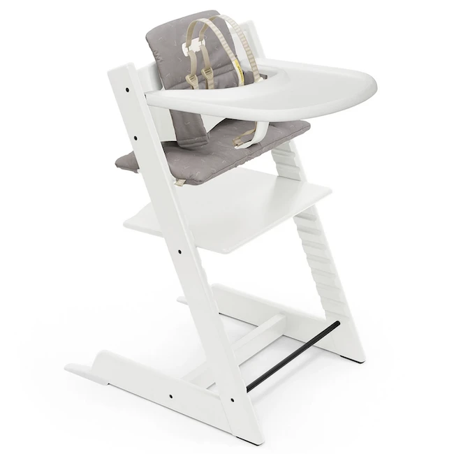 The Tripp Trapp® Chair is conveniently offered in a package that also provides a Tripp Trapp® Baby Set with harness and gliders, plus a Tripp Trapp® Classic Cushion and Tray. When used together, these items make a standalone high chair, which safely and ergonomically sits children from 6 months to 3 years. The adjustable design allows freedom of movement with both depth and height adjustable seat and footplates, ensuring ergonomic seating positions throughout its use. Remove/replace the accessories at a later life stage to continue to use the Tripp Trapp® Chair as your child grows beyond this High Chair stage (3 yrs. old). By removing and/or using without the tray, this High Chair fits right up to your dining table, bringing your baby into the heart of your family to learn and develop alongside you.