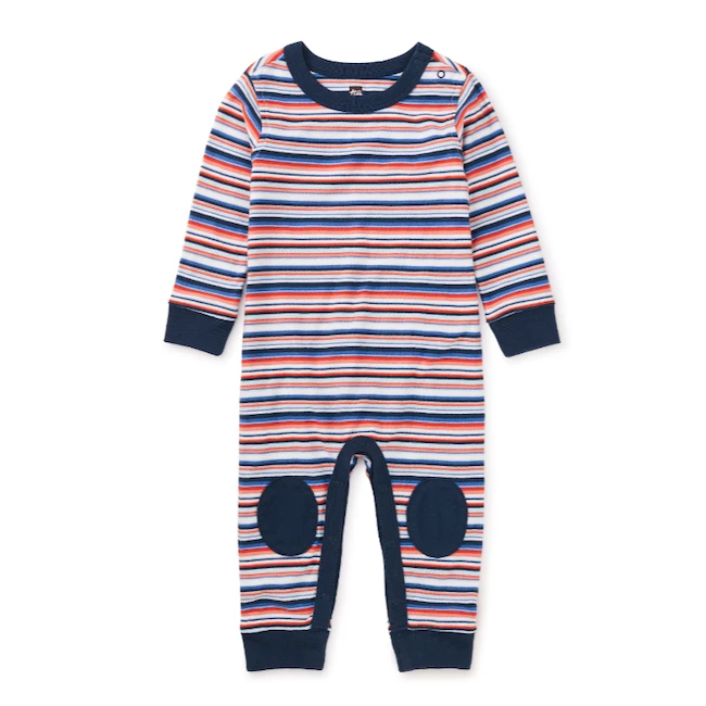 With its cheerful stripe print and cute knee patches for extra comfort, this long sleeve will be a favorite right off the bat. The neck and inner leg snaps ensure easy dressing and diaper changes, 100% soft cotton jersey means baby stays comfy.
