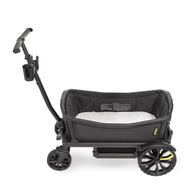 Veer’s Nap System turns your Cruiser into a JPMA safety certified Bassinet, making your Cruiser the ultimate rest stop or changing station for young ones. (The Nap System is suitable from birth up to 20 lbs. [9 Kg] and/or 27” [69 cm], whichever comes first or until your infant pushes up on their hands and knees.) A soft, removable mattress pad is included. The Nap System includes magnets built into its cleanable sidewalls that keep it snug to the Cruiser sidewalls, and includes four bungee connection cords that attach to the seat backs to keep little ones safe. A bug shield that zips on a sun canopy to cover the Cruiser is included (retractable sun canopy sold separately). The Nap System makes a great changing station as well. The Nap System compactly folds up into a storage bag that mounts to Cruiser and it also fits in the Foldable Storage Basket when not in use.