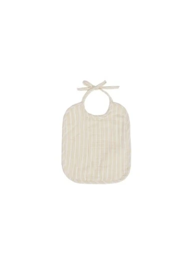Woven gauze bib with terry backing, ties at the neck for a secure fit.